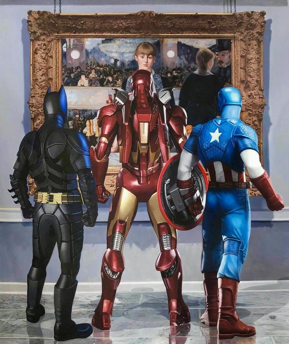 Marc Dennis, Ironman, Captain America and Batman Walk Into a Bar, 2022, oil on linen, 80 x 61 inches