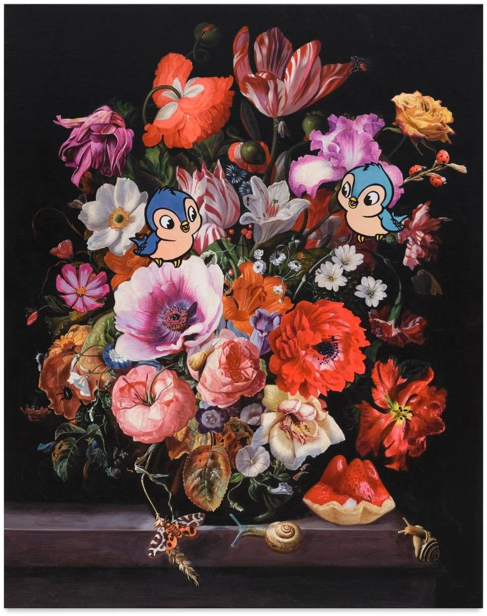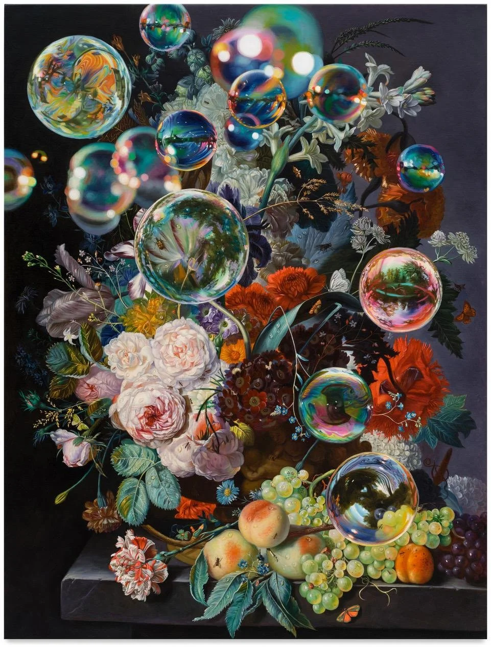 Yes, for example, the bubbles in my painting are thoughts, like thought balloons, that are fleeting. I didn't want the work to be only with flowers, I wanted something that you can “see through,” so there's another sense of space. When my kids were younger and loved bubbles, I thought why not paint bubbles, that's not been done much before, and that's how that idea came, it’s that simple. So, there's your inspiration — life, parenthood, everything is inspiring. Me being a father is in the painting. Let me say the corniest thing I ever said in an interview; I paint about love.